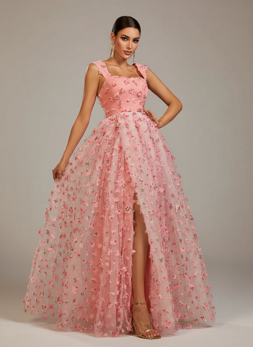 Appliqued Pink Camisole Floral Tulle Dress GM00142