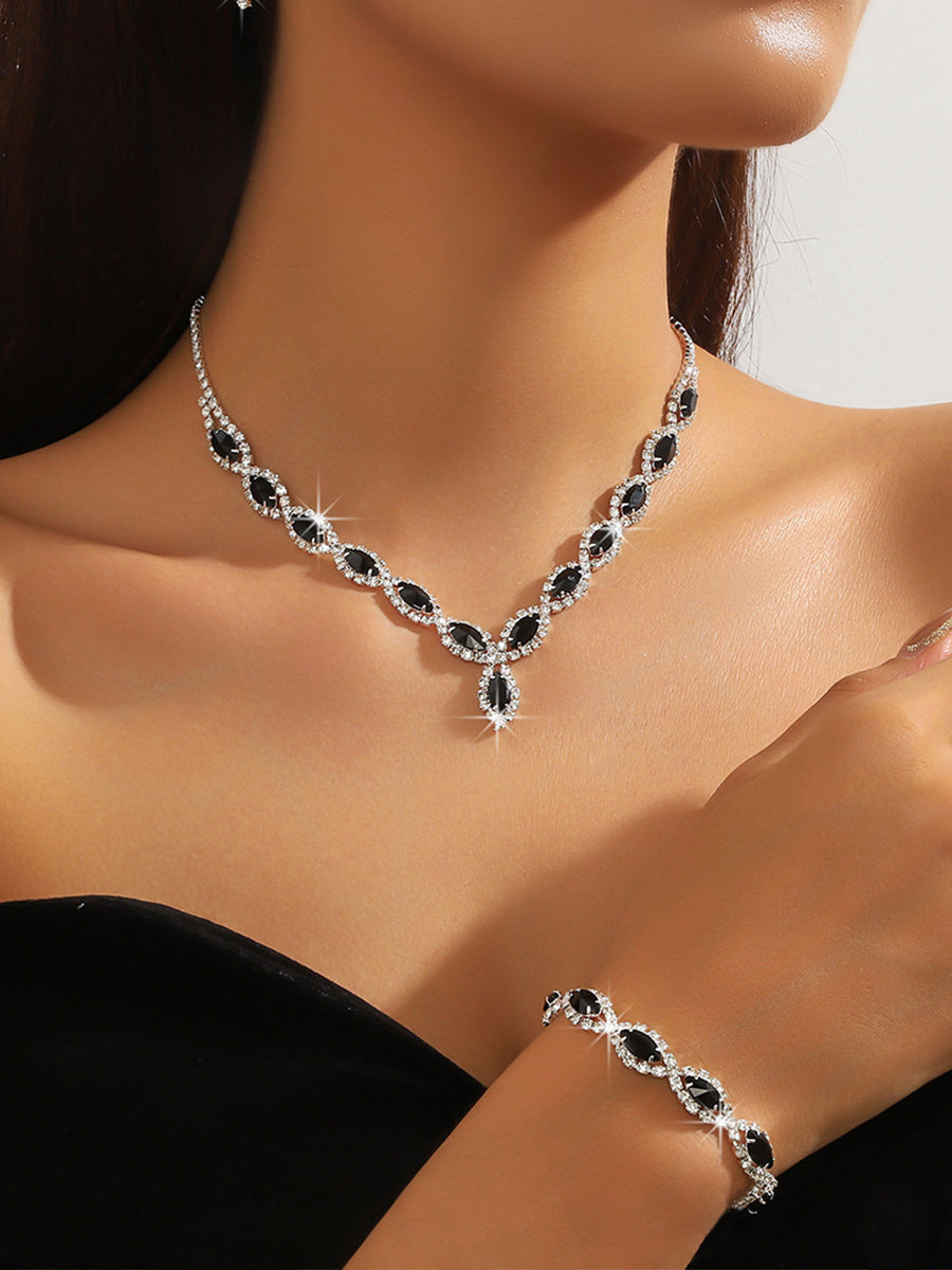 This stunning Sparkling Rhinestone Necklace Earrings Bracelet Set will add a glamorous touch to any ensemble with its sparkling rhinestones and silver-tone accents. An ideal gift for special occasions.